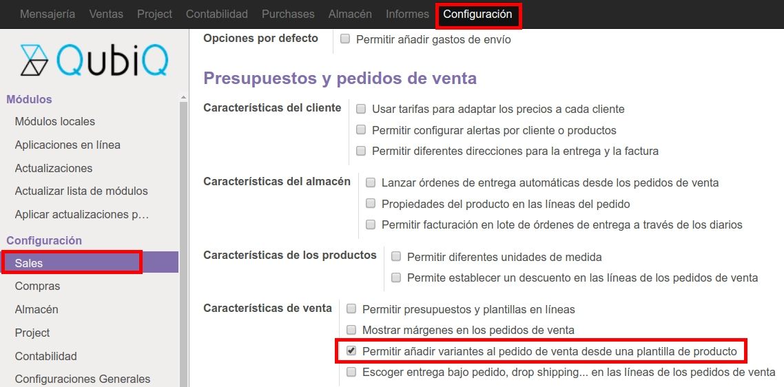 Para crear un pedido, iremos al menú Ventas --> Pedidos de ventas. Cuando queramos añadir las variantes de producto, seleccionaremos el botón de la parte superior izquierda "Añadir variantes" ; esta acción nos abrirá una ventana. En el desplegable "Plantilla", seleccionaremos el producto que queremos añadir en el pedido de venta. Automáticamente, se generarán distintas líneas correspondientes a todas las posibilidades de variantes que nos ofrece el producto en cuestión. Podremos escoger qué cantidad de producto queremos añadir. Una vez finalizado este paso, seleccionaremos "Añadir al pedido" y veremos que se crean las líneas del pedido de venta en función de nuestra selección.
