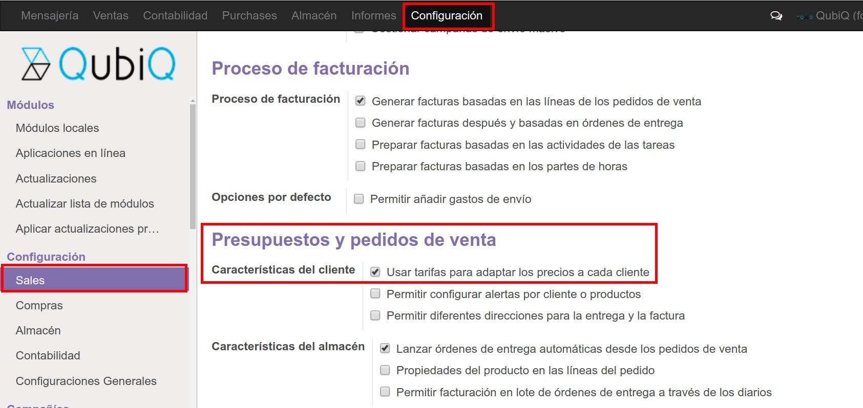 En primer lugar, debemos activar la opción que nos permite establecer distintas tarifas por cada cliente. Podemos encontrarlo en el menú Configuración --> Ventas --> "Usar tarifas para adaptar los precios a cada cliente".