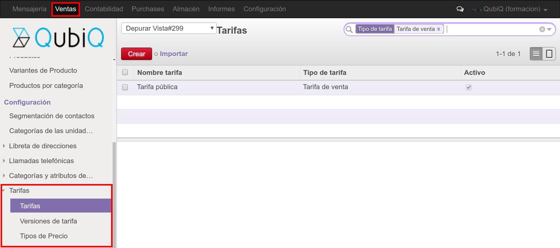Una vez hemos activado el menú, podemos observar que tenemos nuevas opciones en el menú Ventas. Ahora nos aparece el submenú "Tarifas".