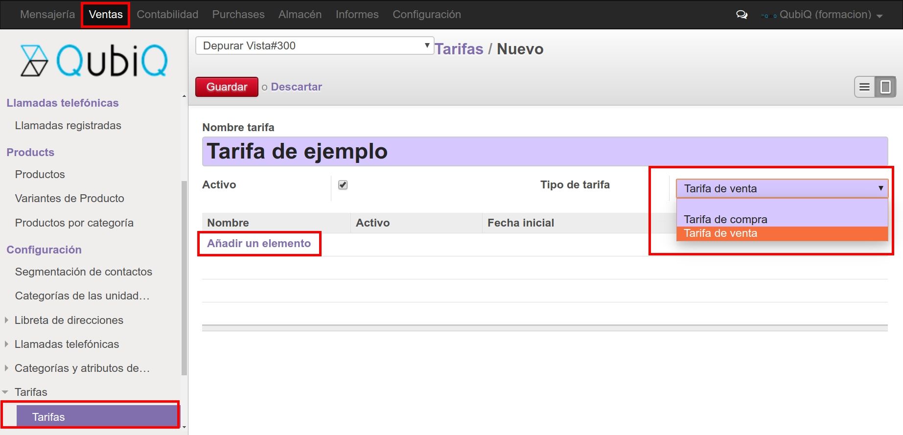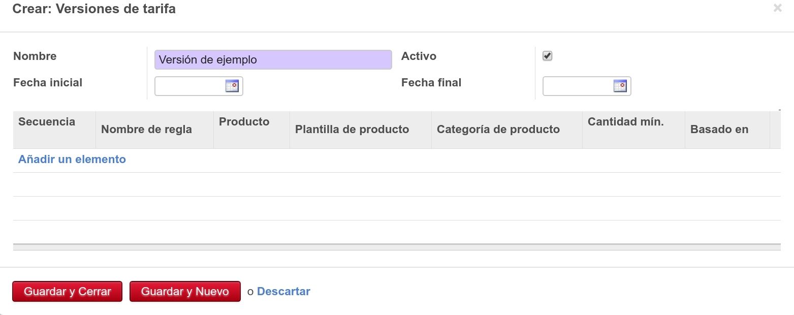 Vamos al menú Ventas --> Tarifas y creamos una nueva. Le asignamos un nombre, escogemos el tipo de tarifa (si es sobre ventas o compras) y hacemos clic en "Añadir un elemento". Se nos abrirá la ventana de "Versiones de Tarifa".