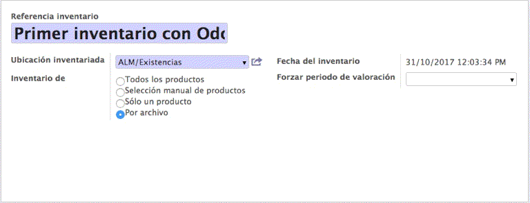 Nombre: nombre que se le quiera añadir, por ejemplo, Primer inventario con Odoo.