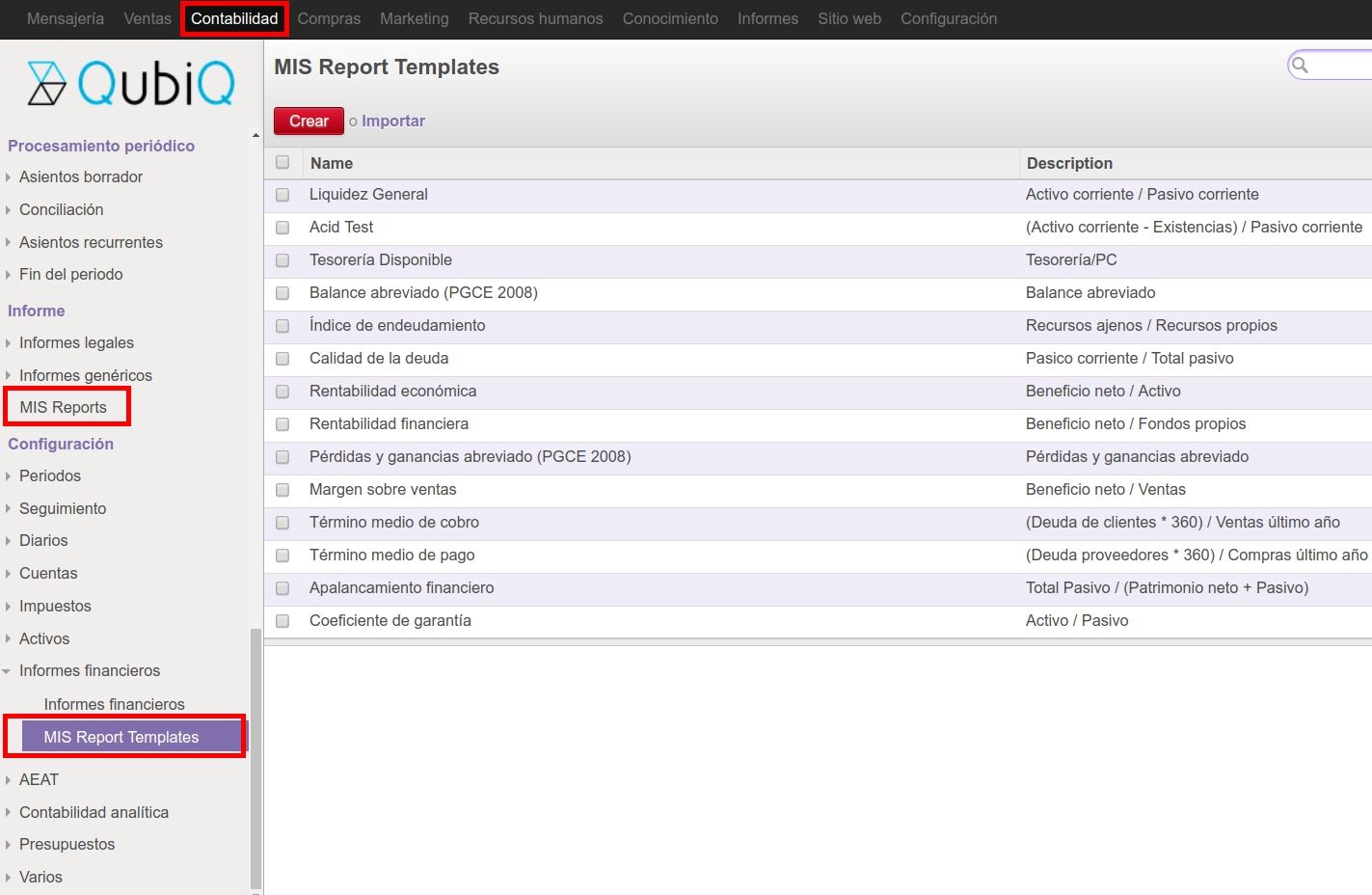 Para crear un nuevo informe, debemos ir al menú Contabilidad -->Informe --> MIS Reports.