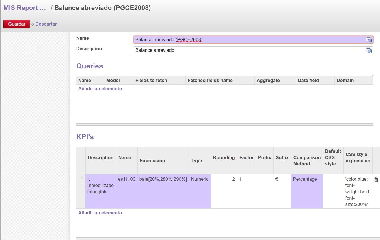 En el menú MIS_Report_Templates, hacemos clic en "Crear" para generar una nueva plantilla. Después de añadir un nombre, por ejemplo "Balance abreviado (PGCE 2008)" y una descripción como podría ser "Balance abreviado", pasamos a determinar los campos de los KPI's.
