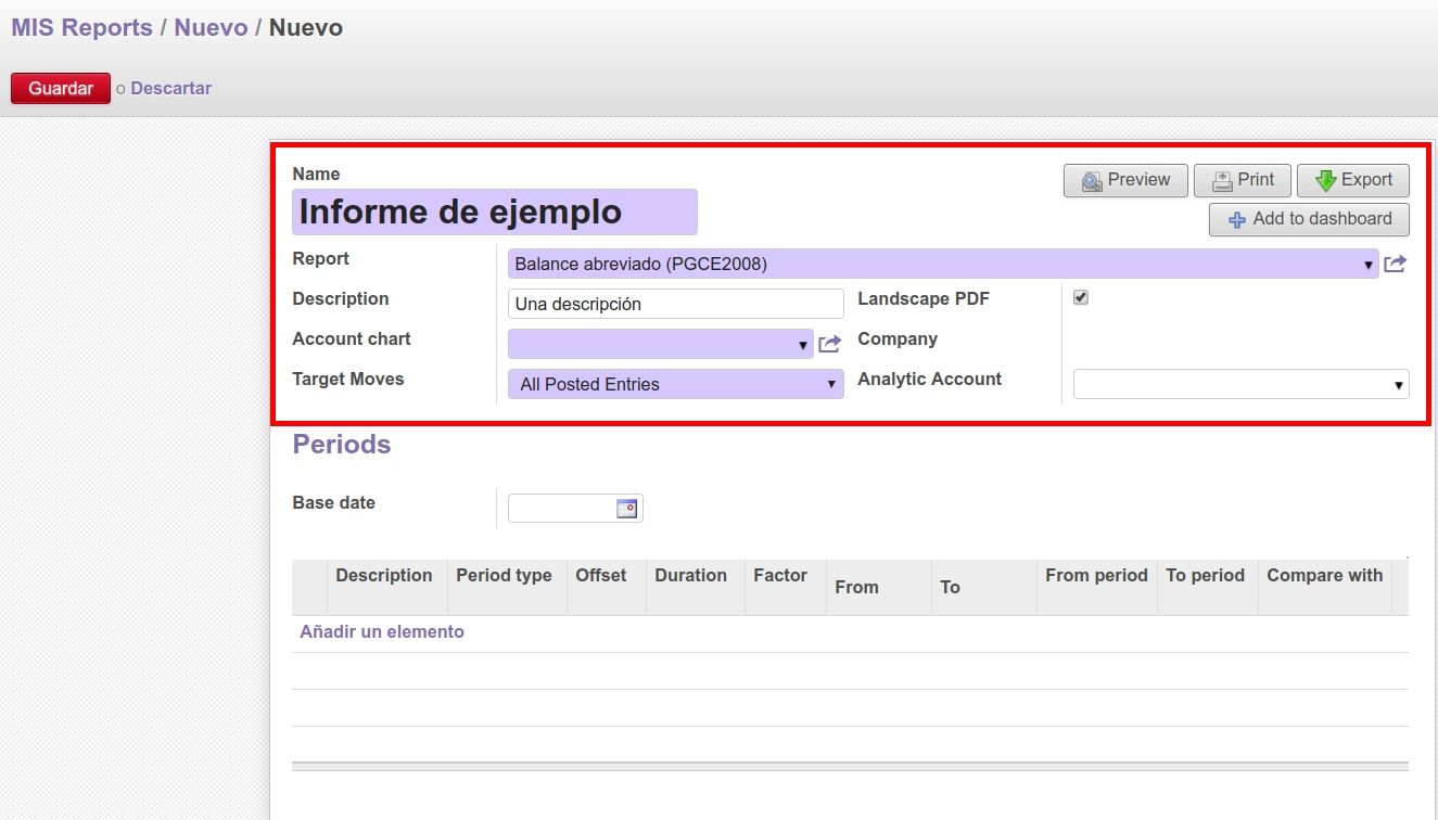 También podemos escoger otros aspectos no obligatorios como el estilo apaisado en pdf, una descripción o una cuenta analítica.