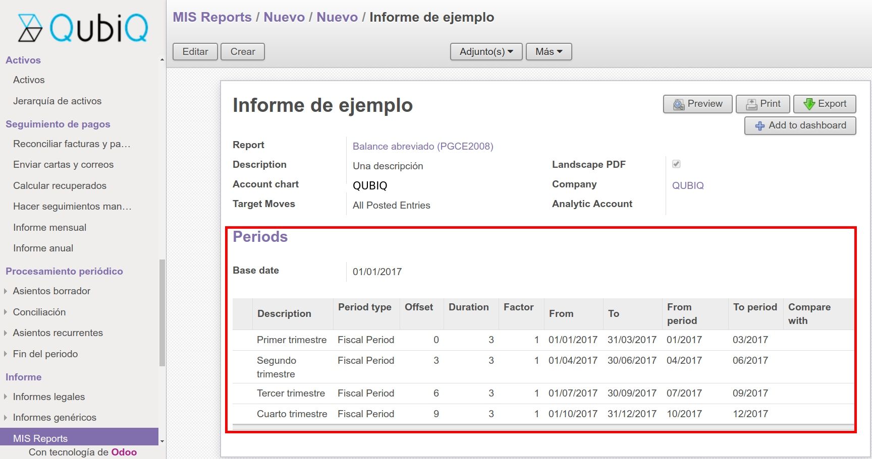 Fecha base: Es la fecha a partir de la cual se empezarán a calcular los periodos. En este caso de ejemplo hemos escogido el inicio del periodo fiscal de 2017.