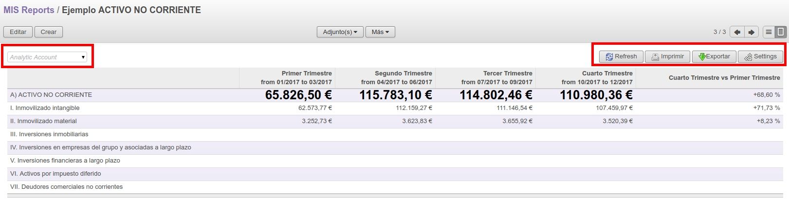 En el supuesto caso de haber incluído más campos, así quedaría por ejemplo, la PREVISUALIZACIÓN de un informe que valorara el ACTIVO NO CORRIENTE. En la imagen superior hemos añadido todos las cuentas contables que le hacen referencia. Los campos vacíos indican que no hay datos. Finalmente, hemos añadido un campo comparativo en la parte de la derecha donde indicamos la evolución del primer al cuarto trimestre.