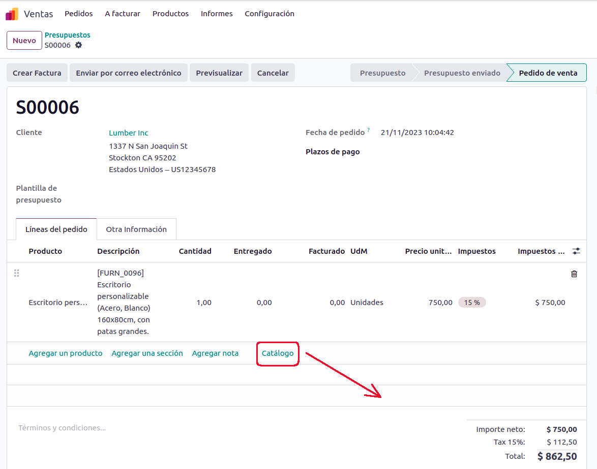 Odoo 17 simplifica la gestión de productos en la Aplicación de Ventas. Ya no necesitas recordar los nombres y códigos de los productos. Simplemente, abre el catálogo (1) y agrega productos a tus órdenes de venta sin esfuerzo.