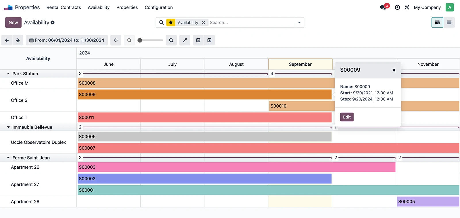 En Odoo podrás visualizar la ocupación de tus propiedades con una vista clara y ordenada que te ayuda a tomar decisiones rápidas y seguras.